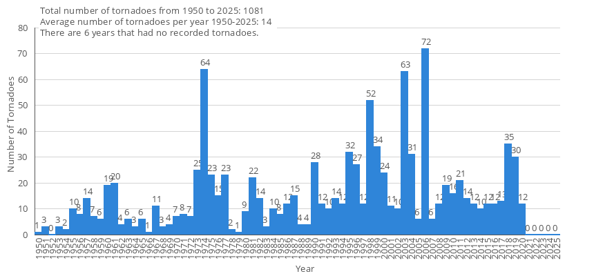 The paths on the map above represent the tornado tracks of all the tornadoes listed in the table below. You may need to zoom in one or more times to view the shorter tracks.