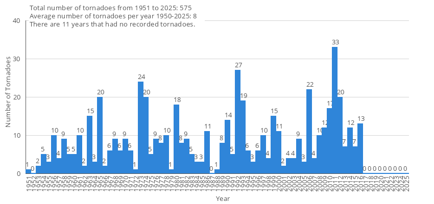 The paths on the map above represent the tornado tracks of all the tornadoes listed in the table below. You may need to zoom in one or more times to view the shorter tracks.